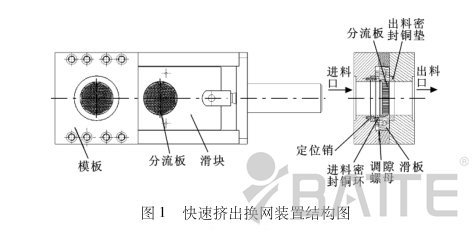 板式換網(wǎng)器結(jié)構(gòu):它主要過(guò)濾部件由滑塊、定位銷(xiāo)、進(jìn)料密封銅環(huán)、調(diào)隙螺母、分流板和出料密封銅墊所組成,如圖1所示。調(diào)隙螺母主要作用是通過(guò)旋轉(zhuǎn)調(diào)節(jié),將進(jìn)料密封銅環(huán)和滑板一端作密封緊配合,防止塑料溶液從進(jìn)料密封銅環(huán)和滑板之間漏出;塑料溶液通過(guò)分流板進(jìn)行過(guò)濾,過(guò)濾后的塑料溶液通過(guò)出料口流出。