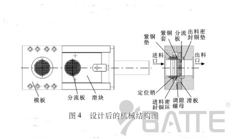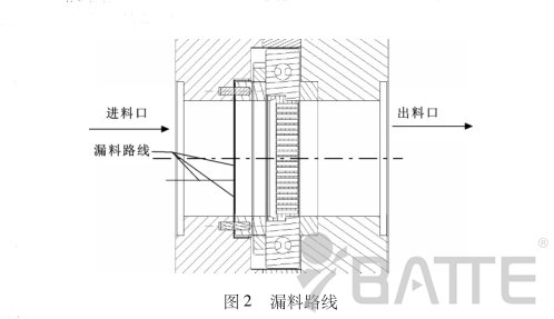 造成板式換網(wǎng)器密封處漏料原因:由圖1不難看出,在進(jìn)料密封環(huán)通過(guò)調(diào)隙螺母與滑板緊密配合的情況下,進(jìn)料密封銅環(huán)的另一端會(huì)和進(jìn)料口的底端面分離,即產(chǎn)生一定的間隙。在這種情況下,要想真正不漏料,只有進(jìn)料密封銅環(huán)的外徑和進(jìn)料密封銅環(huán)放置槽的配合精度很高才行。但事實(shí)上,在加工中,由于加工誤差的原因,這種高配合是很難做到的,這時(shí)就會(huì)出現(xiàn)如圖2所示的現(xiàn)象,會(huì)產(chǎn)生微小的相對(duì)配合間隙。由圖2不難看出,當(dāng)塑料溶液受到的壓力稍大時(shí)就會(huì)從產(chǎn)生的間隙中漏出來(lái)。